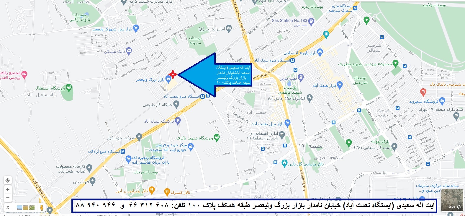 * آدرس: بزرگراه سعیدی شهرک ولیعصر (ایستگاه مترو نعمت آباد) جنب پمپ گاز خیابان نامدار